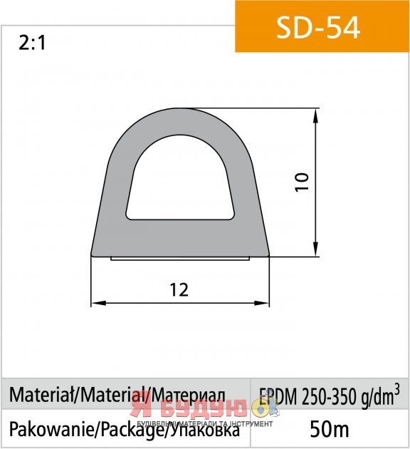 Повна довжина ущільнювача в 1 бухті - 50 м (25 м подвійного ущільнювача). Розмір: 10x12 мм (гаражний)