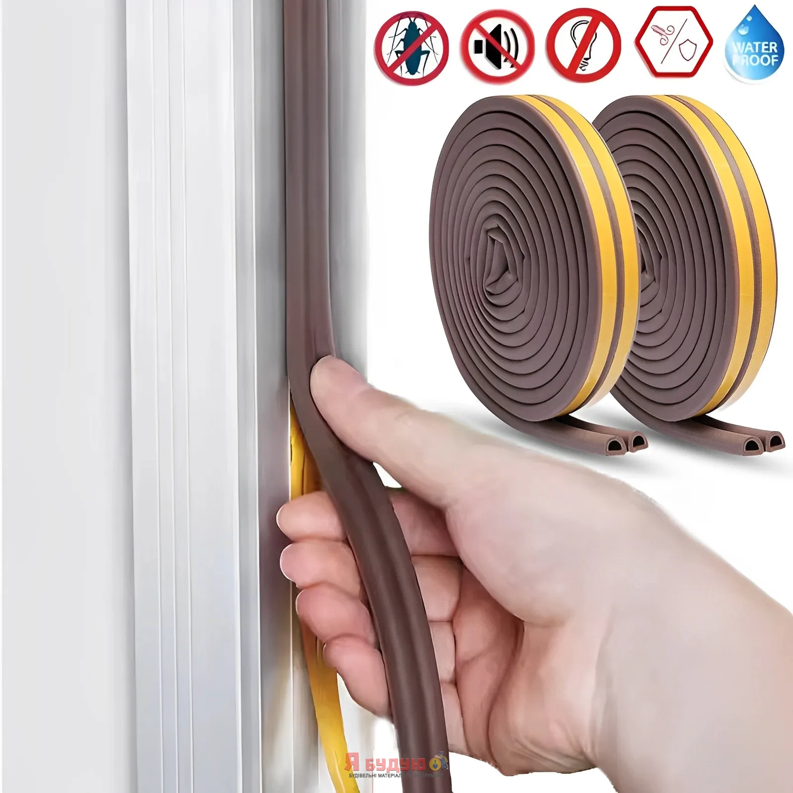 Ущільнювач наклеюється по периметру віконних рам і дверних отворів, гаражних воріт і металоконструкцій, які попередньо необхідно добре очистити й знежирити. Забезпечує захист приміщень від температурних дій, вітру, шуму, дощу, пилу, комах та вихлопних газів. Використання D-подібного ущільнювача 14х12 мм гарантує ідеальне закриття більш великих щілин, дозволяє економити до 35% енергії.