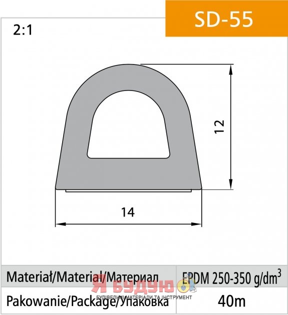 Повна довжина ущільнювача в 1 бухті - 40 м (20 м подвійного ущільнювача). Розмір: 14x12 мм (гаражний)