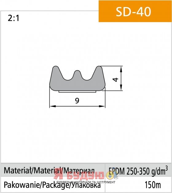 Повна довжина ущільнювача в 1 бухті - 150 м (75 м подвійного ущільнювача). Розмір: 9x4 мм