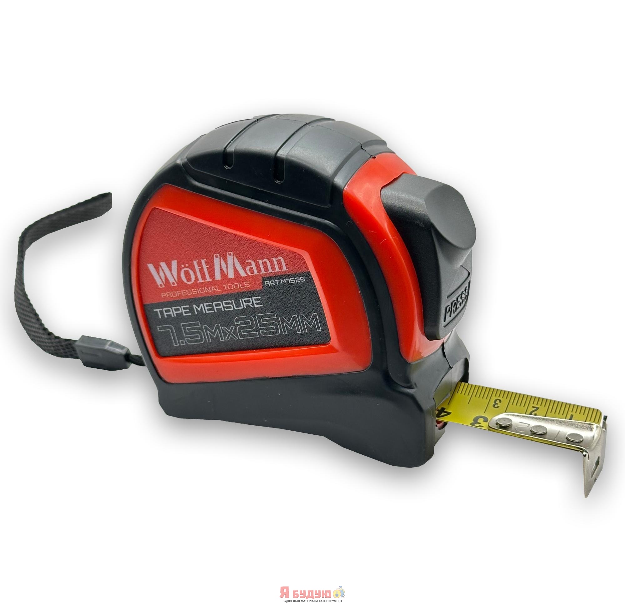 Професійна вимірювальна рулетка 7,5м × 25мм "WoffMann" призначена для вимірювання довжини під час проведення будівельних або ремонтних робіт, надає високу точність вимірів і зручність у використанні.