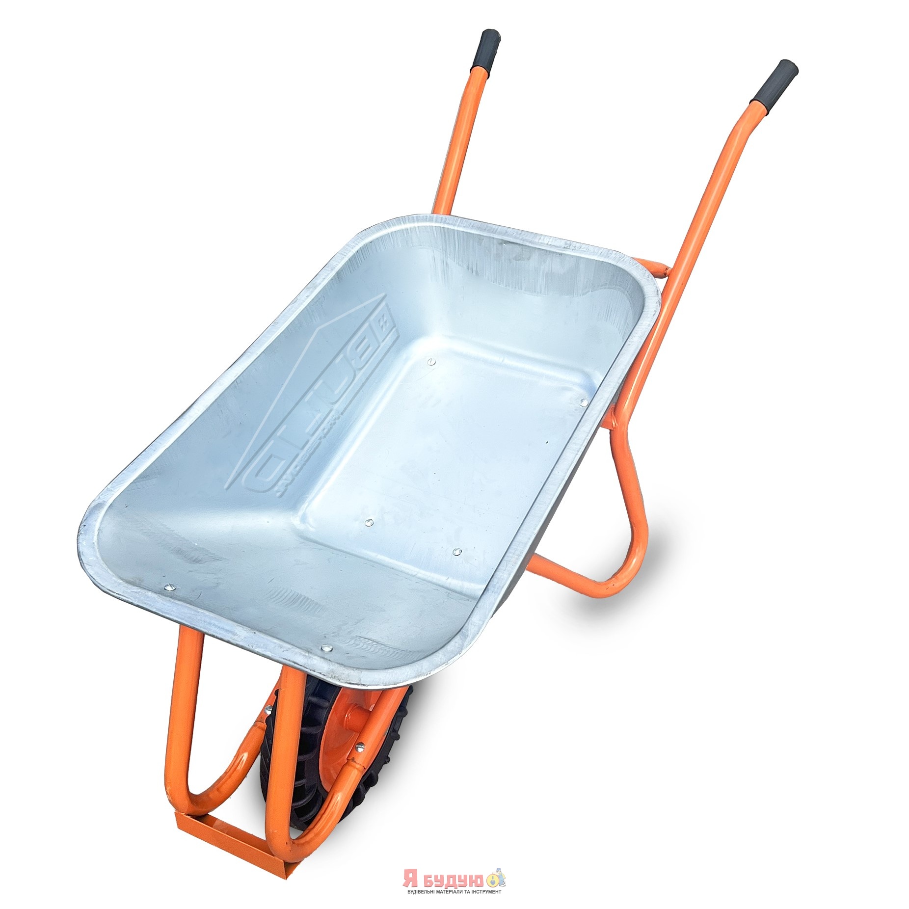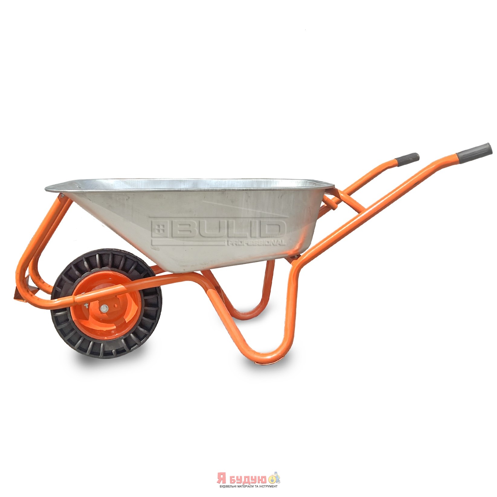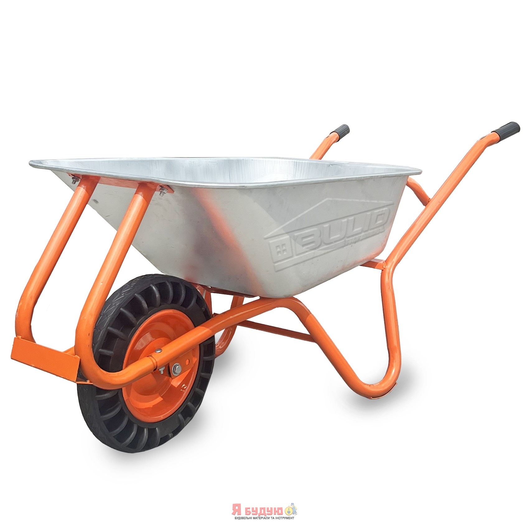 Тачка 1-о колесна d400мм 100л 180кг оцин (буд. проф.) ЦІЛЬНОГУМ КОЛЕСО 4.00-8 ORANGE ТМ "BULID"