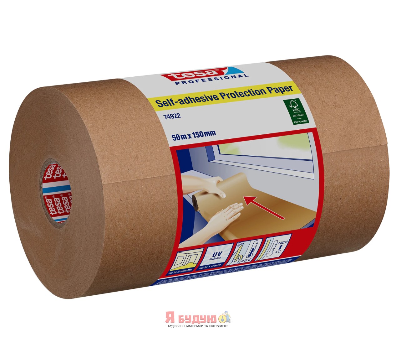 Самоклеючий захисний папір tesa® для швидкого та чистого захисту та покриття великої площі, виготовлений зі 100% переробленого волокна та сертифікований FSC®.