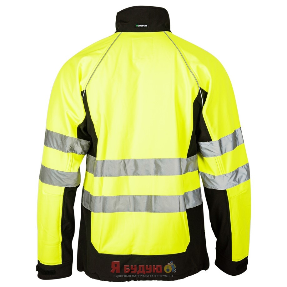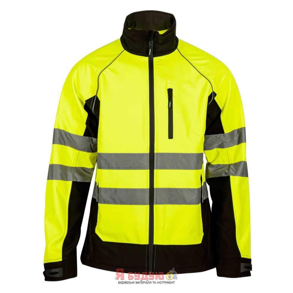 Сучасний, зручний, функціональний дизайн куртки флуоресцентного лимонного кольору, із світловідбиваючими смугами (з найвищим ступенем відображення 2-го класу)